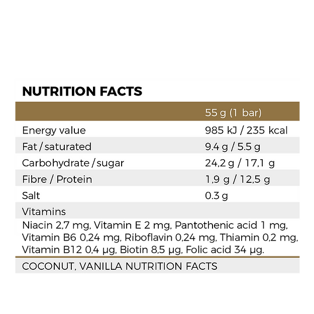 Esta barrita proteica de excelente sabor y equilibrada proporción de proteínas y vitaminas, suministra elcantidad necesaria de energía. Contiene 23 % de proteína yuna mezcla de nueve vitaminas, además, es una buena fuente de fibra.